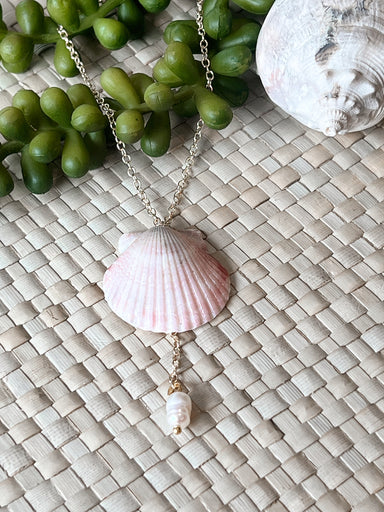 This necklace features a beautiful, solid white scallop shell with gold hand painted along the edges. With its freshwater pearl and shimmery accent...