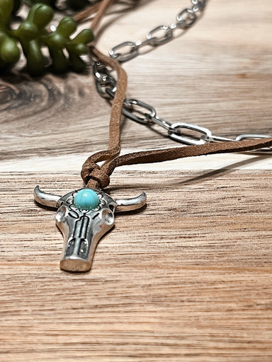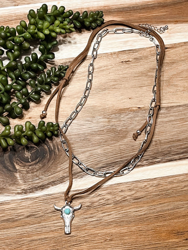 Add a touch of the wild west to your style with our double layered necklace. Featuring a bold chunky silver chain and an adjustable faux leather ne...