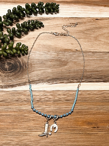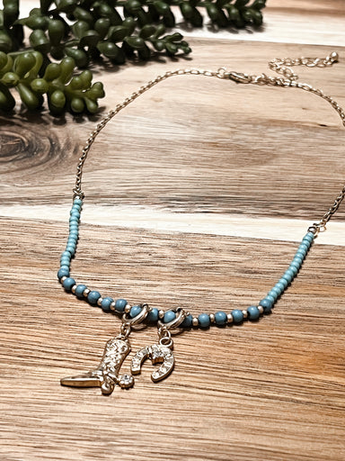 Transform any outfit into a lucky one with our Lucky Boots Necklace. Gold tone charms, adorned with sparkling rhinestones, hang from a dainty beade...