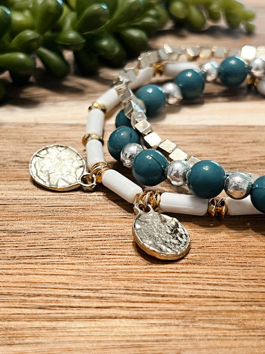 Unleash your boho chic style with our Deep Teal Stretch Bracelet Set. This unique set features a beautiful mix of natural and metallic elements tha...