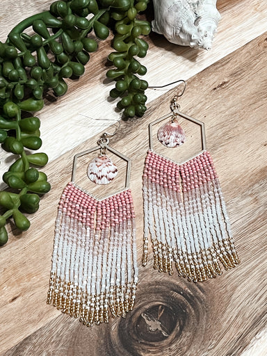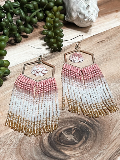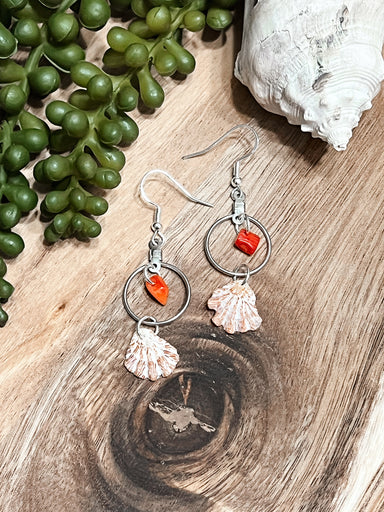 Beautiful hand beaded earrings inspired by the coastal vibes of Southwest Florida made with calico scallop shells and shimmery beads hand sewn toge...
